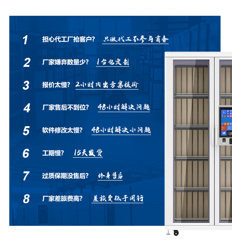 有15年管家式服務中間商的成熟經驗。成熟產品有RFID糖心破解免费、稱重櫃、光敏櫃、智能工具車、公檢法檔案管理櫃。支撐軟件定製開發。